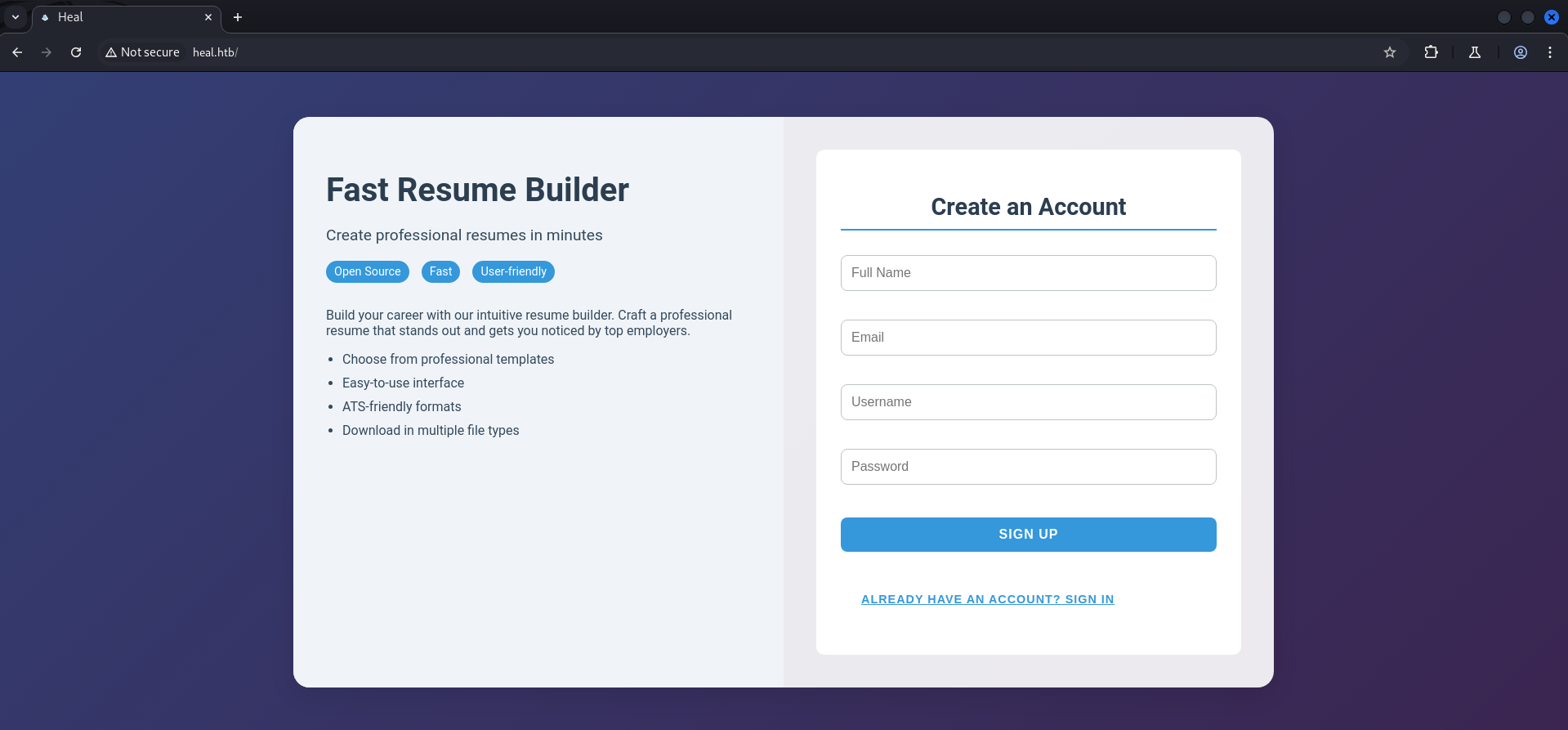 Next we accessed the web server which provided a Fast Resume Builder web application running on port 80/TCP.