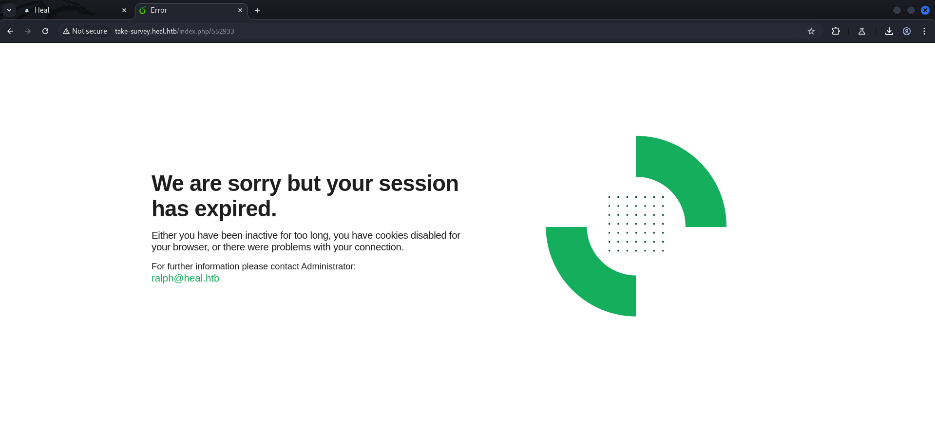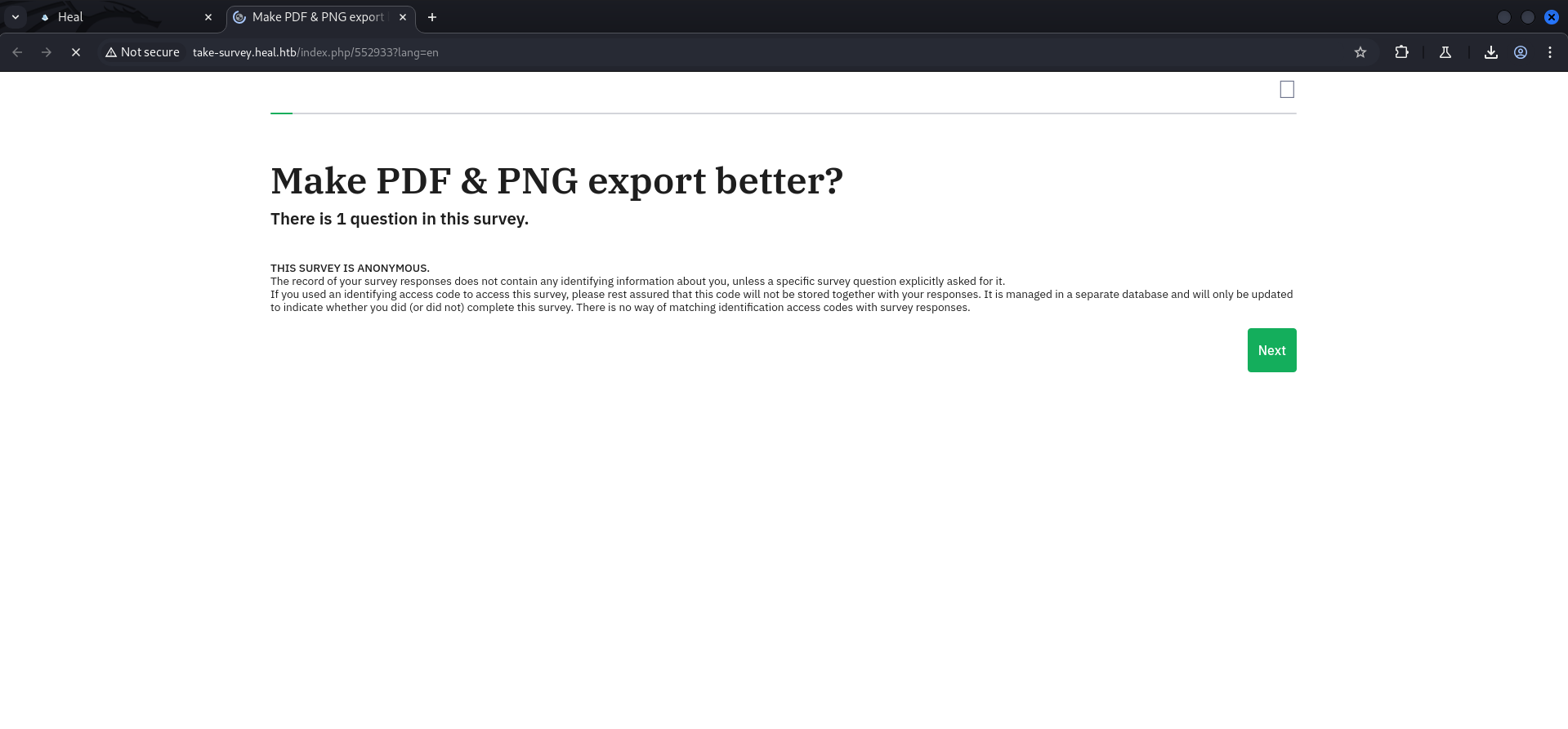 As usual we started we a basic port scan using Nmap. The Box redirected traffic going to port 80/TCP on the IP address to http://heal.htb/ which we added to our /etc/hosts file.
