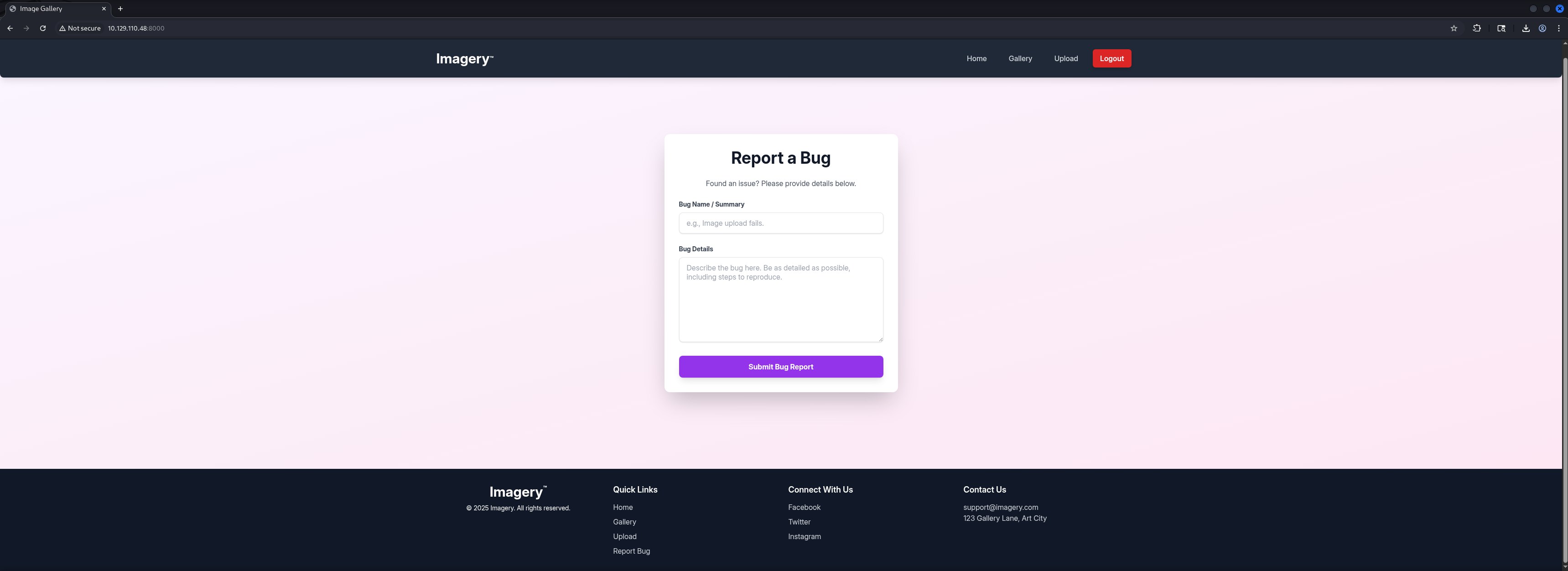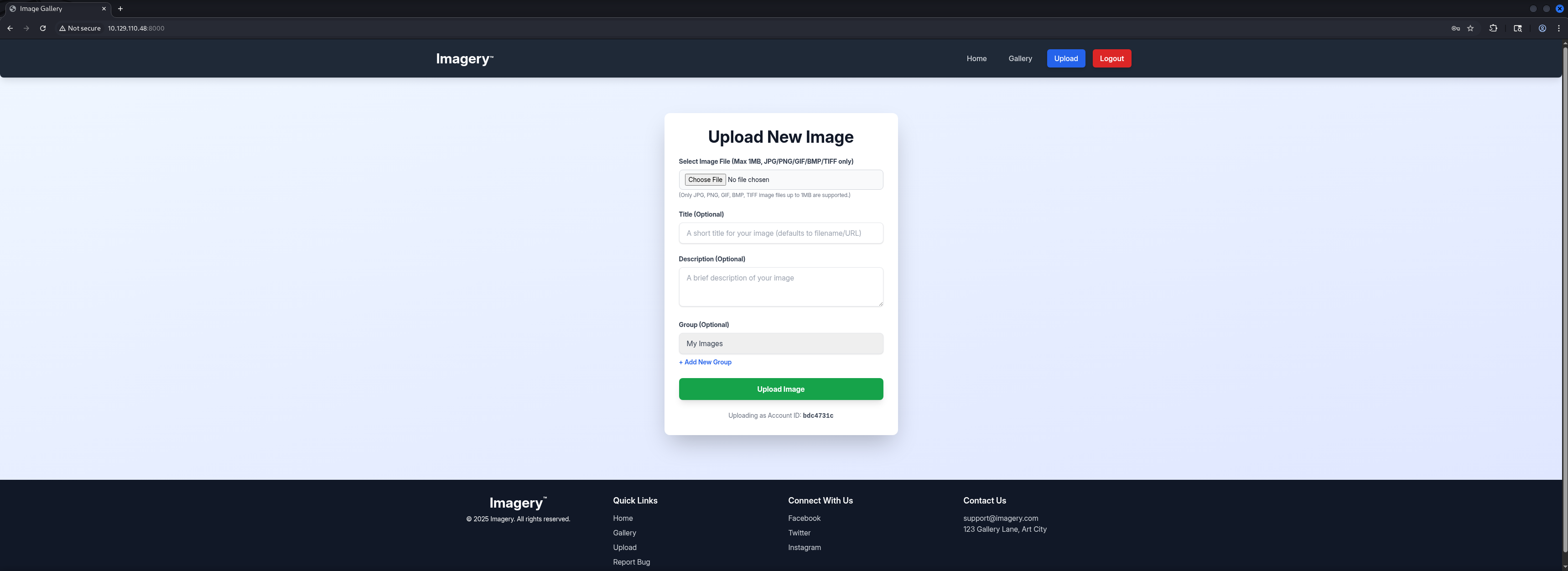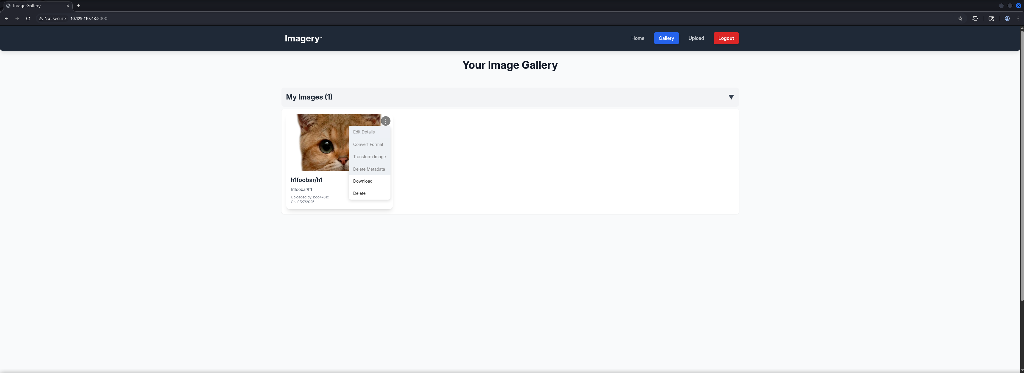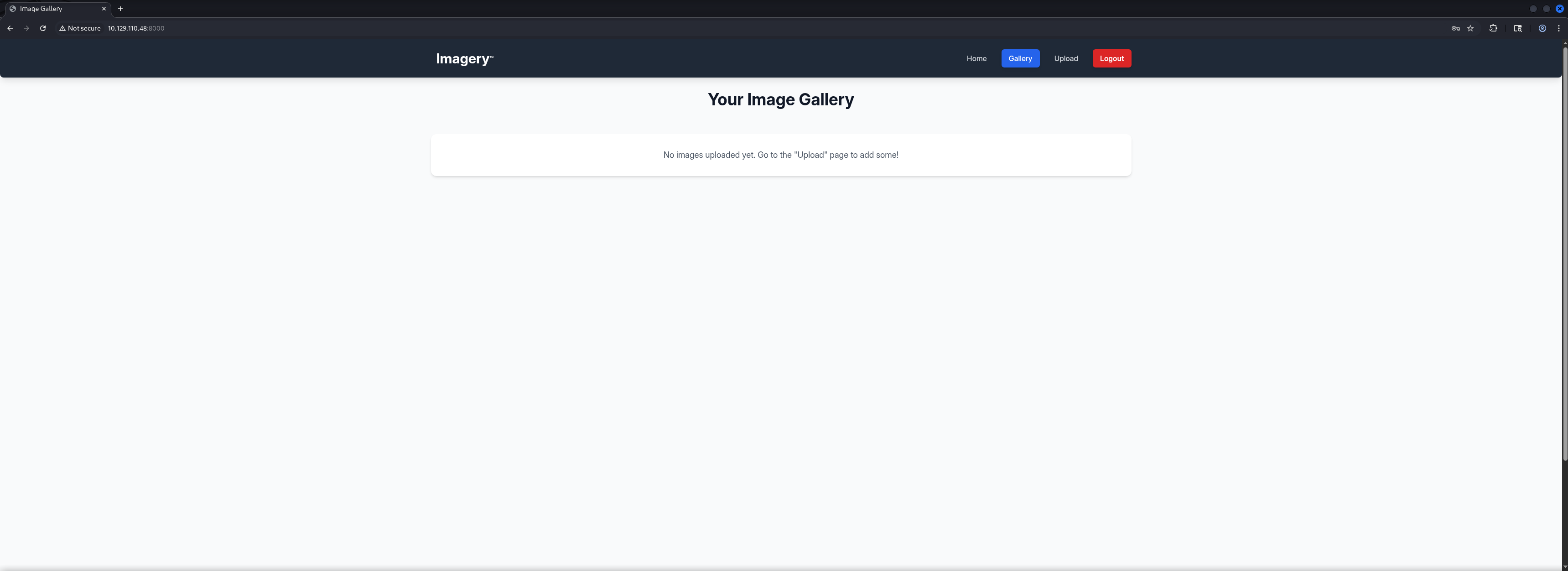 http://10.129.110.48:8000/ [200 OK] Country[RESERVED][ZZ], Email[[email protected]], HTML5, HTTPServer[Werkzeug/3.1.3 Python/3.12.7], IP[10.129.110.48], Python[3.12.7], Script, Title[Image Gallery], Werkzeug[3.1.3]