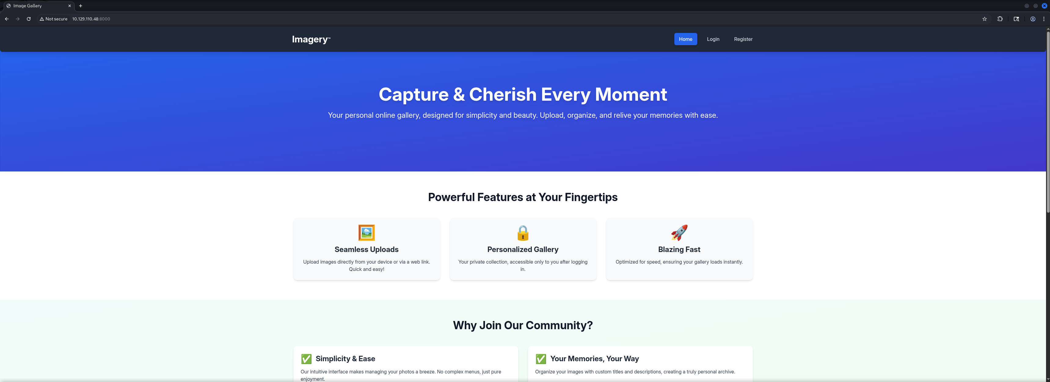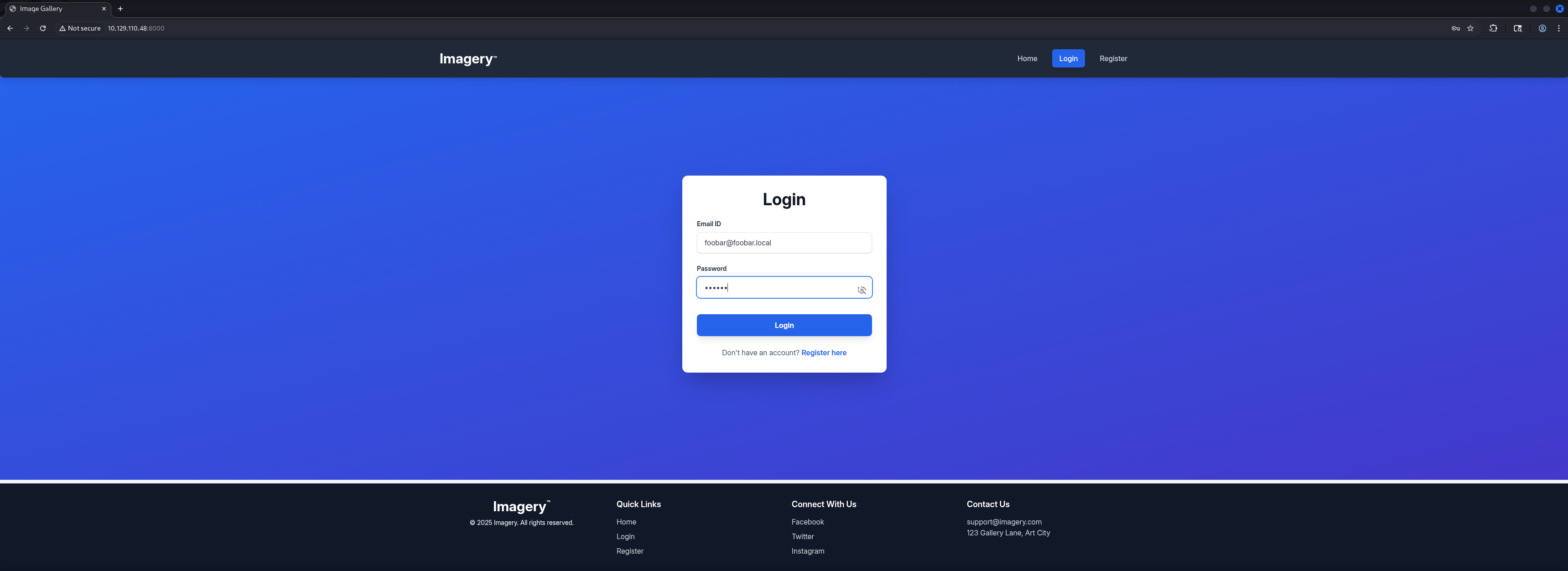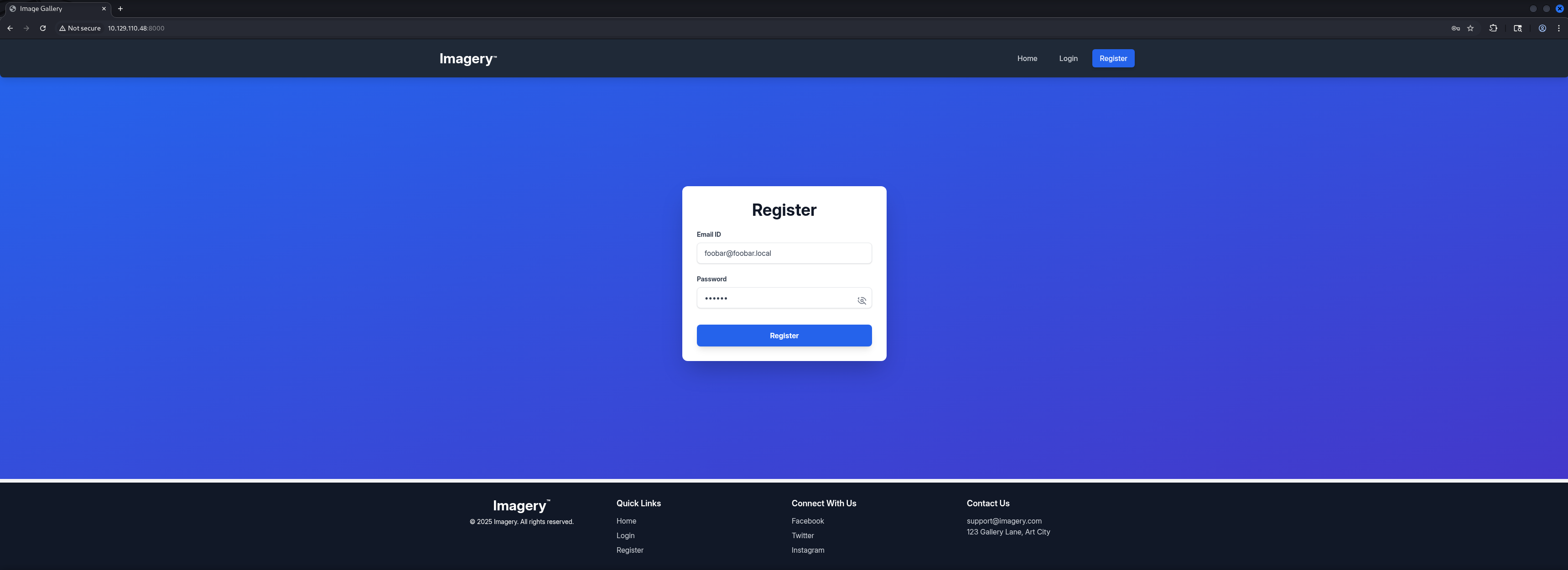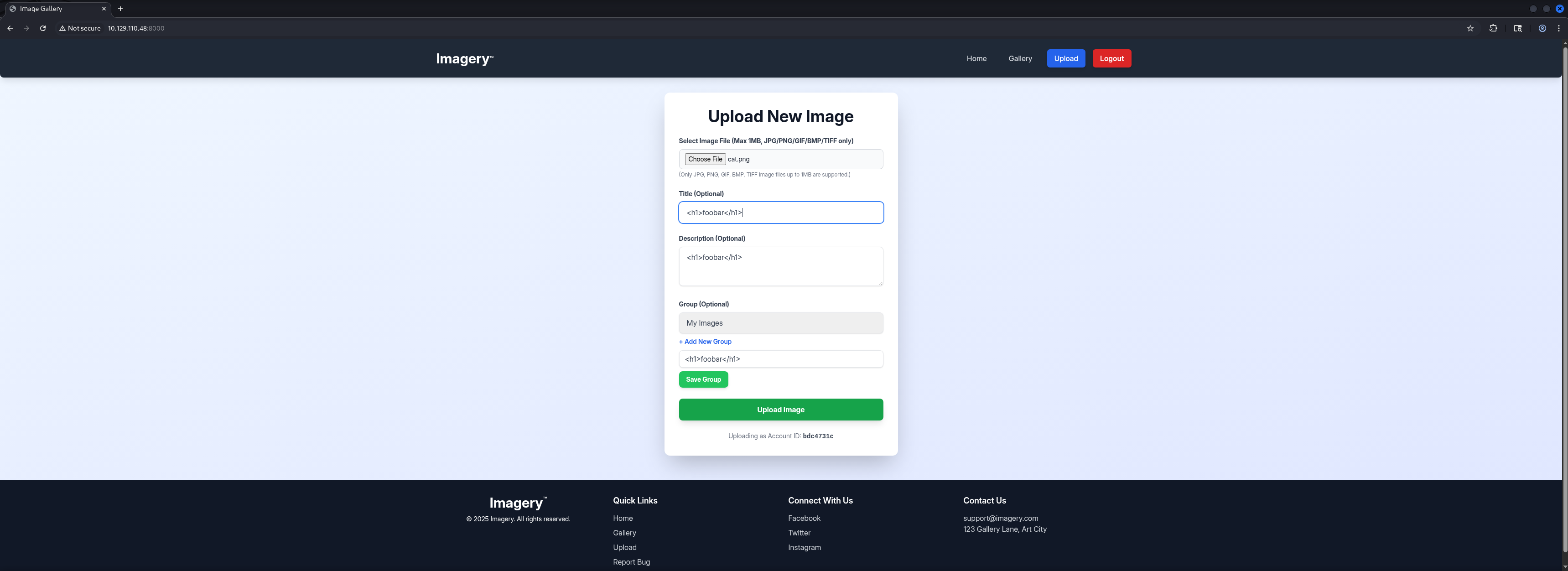 http://10.129.110.48:8000/ [200 OK] Country[RESERVED][ZZ], Email[[email protected]], HTML5, HTTPServer[Werkzeug/3.1.3 Python/3.12.7], IP[10.129.110.48], Python[3.12.7], Script, Title[Image Gallery], Werkzeug[3.1.3]