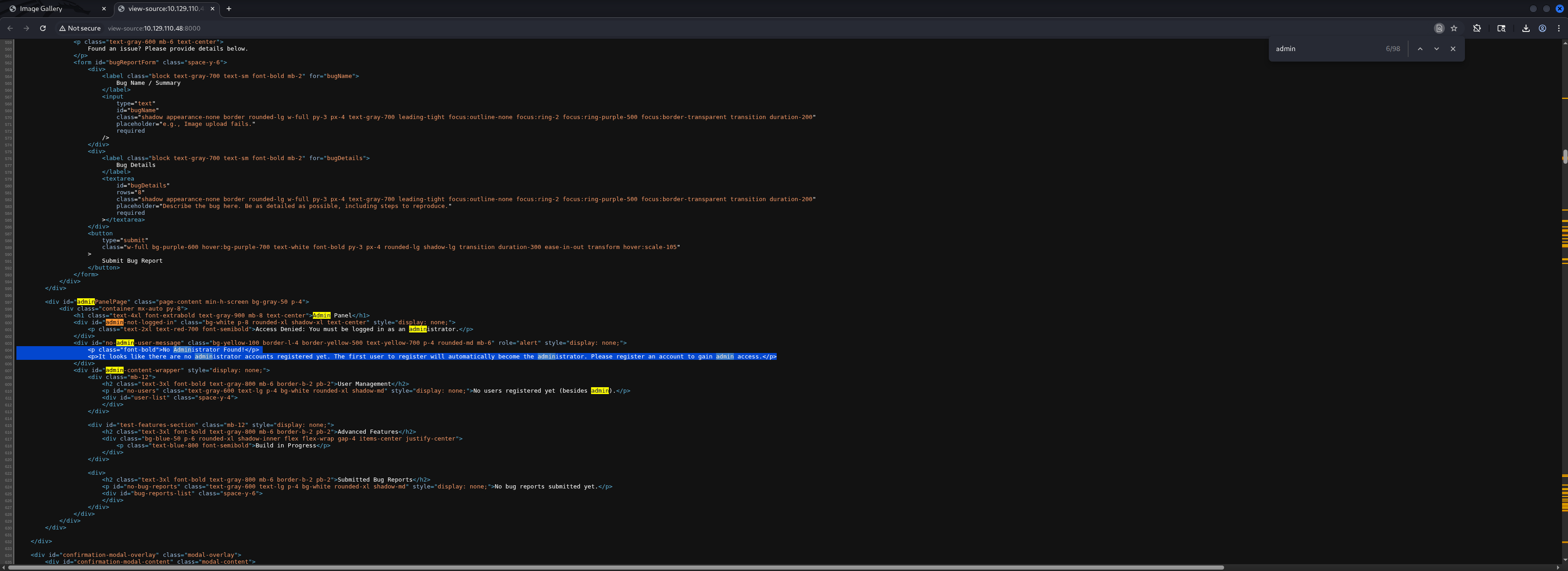 Next we checked the Website Source and found a hint about the Account for Administrator which indicated that either we would be already Administrator because we registered a user or the more likely option, that there would be another user we need to target.