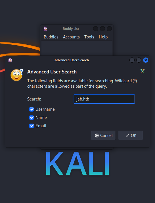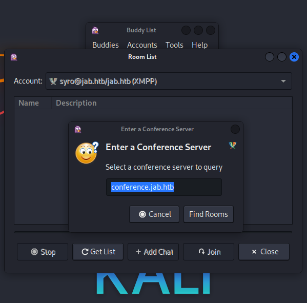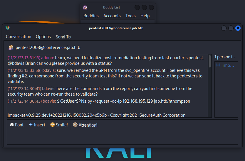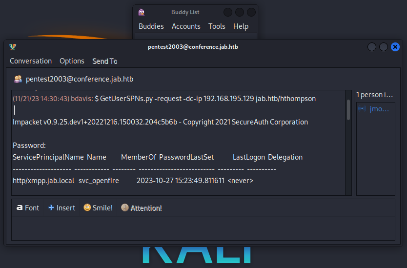 ┌──(kali㉿kali)-[~] └─$ sudo nmap -sC -sV 10.129.147.202 [sudo] password for kali: Starting Nmap 7.94SVN ( https://nmap.org ) at 2024-02-24 14:00 EST Nmap scan report for 10.129.147.202 Host is up (0.070s latency). Not shown: 984 closed tcp ports (reset) PORT STATE SERVICE VERSION 53/tcp open domain Simple DNS Plus 88/tcp open kerberos-sec Microsoft Windows Kerberos (server time: 2024-02-24 19:02:26Z) 135/tcp open msrpc Microsoft Windows RPC 139/tcp open netbios-ssn Microsoft Windows netbios-ssn 389/tcp open ldap Microsoft Windows Active Directory LDAP (Domain: jab.htb0., Site: Default-First-Site-Name) | ssl-cert: Subject: commonName=DC01.jab.htb | Subject Alternative Name: othername: 1.3.6.1.4.1.311.25.1::<unsupported>, DNS:DC01.jab.htb | Not valid before: 2023-11-01T20:16:18 |_Not valid after: 2024-10-31T20:16:18 |_ssl-date: 2024-02-24T19:03:18+00:00; +2m10s from scanner time. 445/tcp open microsoft-ds? 464/tcp open kpasswd5? 593/tcp open ncacn_http Microsoft Windows RPC over HTTP 1.0 636/tcp open ssl/ldap Microsoft Windows Active Directory LDAP (Domain: jab.htb0., Site: Default-First-Site-Name) |_ssl-date: 2024-02-24T19:03:17+00:00; +2m10s from scanner time. | ssl-cert: Subject: commonName=DC01.jab.htb | Subject Alternative Name: othername: 1.3.6.1.4.1.311.25.1::<unsupported>, DNS:DC01.jab.htb | Not valid before: 2023-11-01T20:16:18 |_Not valid after: 2024-10-31T20:16:18 3268/tcp open ldap Microsoft Windows Active Directory LDAP (Domain: jab.htb0., Site: Default-First-Site-Name) |_ssl-date: 2024-02-24T19:03:18+00:00; +2m10s from scanner time. | ssl-cert: Subject: commonName=DC01.jab.htb | Subject Alternative Name: othername: 1.3.6.1.4.1.311.25.1::<unsupported>, DNS:DC01.jab.htb | Not valid before: 2023-11-01T20:16:18 |_Not valid after: 2024-10-31T20:16:18 3269/tcp open ssl/ldap Microsoft Windows Active Directory LDAP (Domain: jab.htb0., Site: Default-First-Site-Name) |_ssl-date: 2024-02-24T19:03:17+00:00; +2m10s from scanner time. | ssl-cert: Subject: commonName=DC01.jab.htb | Subject Alternative Name: othername: 1.3.6.1.4.1.311.25.1::<unsupported>, DNS:DC01.jab.htb | Not valid before: 2023-11-01T20:16:18 |_Not valid after: 2024-10-31T20:16:18 5222/tcp open jabber Ignite Realtime Openfire Jabber server 3.10.0 or later | ssl-cert: Subject: commonName=dc01.jab.htb | Subject Alternative Name: DNS:dc01.jab.htb, DNS:*.dc01.jab.htb | Not valid before: 2023-10-26T22:00:12 |_Not valid after: 2028-10-24T22:00:12 | xmpp-info: | STARTTLS Failed | info: | auth_mechanisms: | xmpp: | version: 1.0 | stream_id: 8nqbepj4v2 | capabilities: | unknown: | errors: | invalid-namespace | (timeout) | features: |_ compression_methods: |_ssl-date: TLS randomness does not represent time 5269/tcp open xmpp Wildfire XMPP Client | xmpp-info: | STARTTLS Failed | info: | auth_mechanisms: | xmpp: | capabilities: | unknown: | errors: | (timeout) | features: |_ compression_methods: 7070/tcp open realserver? | fingerprint-strings: | DNSStatusRequestTCP, DNSVersionBindReqTCP: | HTTP/1.1 400 Illegal character CNTL=0x0 | Content-Type: text/html;charset=iso-8859-1 | Content-Length: 69 | Connection: close | <h1>Bad Message 400</h1><pre>reason: Illegal character CNTL=0x0</pre> | GetRequest: | HTTP/1.1 200 OK | Date: Sat, 24 Feb 2024 19:02:26 GMT | Last-Modified: Wed, 16 Feb 2022 15:55:02 GMT | Content-Type: text/html | Accept-Ranges: bytes | Content-Length: 223 | <html> | <head><title>Openfire HTTP Binding Service</title></head> | <body><font face="Arial, Helvetica"><b>Openfire <a href="http://www.xmpp.org/extensions/xep-0124.html">HTTP Binding</a> Service</b></font></body> | </html> | HTTPOptions: | HTTP/1.1 200 OK | Date: Sat, 24 Feb 2024 19:02:31 GMT | Allow: GET,HEAD,POST,OPTIONS | Help: | HTTP/1.1 400 No URI | Content-Type: text/html;charset=iso-8859-1 | Content-Length: 49 | Connection: close | <h1>Bad Message 400</h1><pre>reason: No URI</pre> | RPCCheck: | HTTP/1.1 400 Illegal character OTEXT=0x80 | Content-Type: text/html;charset=iso-8859-1 | Content-Length: 71 | Connection: close | <h1>Bad Message 400</h1><pre>reason: Illegal character OTEXT=0x80</pre> | RTSPRequest: | HTTP/1.1 505 Unknown Version | Content-Type: text/html;charset=iso-8859-1 | Content-Length: 58 | Connection: close | <h1>Bad Message 505</h1><pre>reason: Unknown Version</pre> | SSLSessionReq: | HTTP/1.1 400 Illegal character CNTL=0x16 | Content-Type: text/html;charset=iso-8859-1 | Content-Length: 70 | Connection: close |_ <h1>Bad Message 400</h1><pre>reason: Illegal character CNTL=0x16</pre> 7443/tcp open ssl/oracleas-https? | fingerprint-strings: | DNSStatusRequestTCP, DNSVersionBindReqTCP: | HTTP/1.1 400 Illegal character CNTL=0x0 | Content-Type: text/html;charset=iso-8859-1 | Content-Length: 69 | Connection: close | <h1>Bad Message 400</h1><pre>reason: Illegal character CNTL=0x0</pre> | GetRequest: | HTTP/1.1 200 OK | Date: Sat, 24 Feb 2024 19:02:32 GMT | Last-Modified: Wed, 16 Feb 2022 15:55:02 GMT | Content-Type: text/html | Accept-Ranges: bytes | Content-Length: 223 | <html> | <head><title>Openfire HTTP Binding Service</title></head> | <body><font face="Arial, Helvetica"><b>Openfire <a href="http://www.xmpp.org/extensions/xep-0124.html">HTTP Binding</a> Service</b></font></body> | </html> | HTTPOptions: | HTTP/1.1 200 OK | Date: Sat, 24 Feb 2024 19:02:38 GMT | Allow: GET,HEAD,POST,OPTIONS | Help: | HTTP/1.1 400 No URI | Content-Type: text/html;charset=iso-8859-1 | Content-Length: 49 | Connection: close | <h1>Bad Message 400</h1><pre>reason: No URI</pre> | RPCCheck: | HTTP/1.1 400 Illegal character OTEXT=0x80 | Content-Type: text/html;charset=iso-8859-1 | Content-Length: 71 | Connection: close | <h1>Bad Message 400</h1><pre>reason: Illegal character OTEXT=0x80</pre> | RTSPRequest: | HTTP/1.1 505 Unknown Version | Content-Type: text/html;charset=iso-8859-1 | Content-Length: 58 | Connection: close | <h1>Bad Message 505</h1><pre>reason: Unknown Version</pre> | SSLSessionReq: | HTTP/1.1 400 Illegal character CNTL=0x16 | Content-Type: text/ht