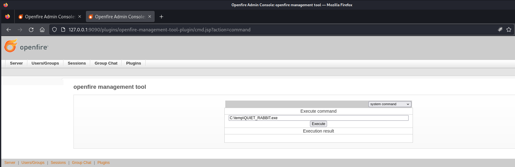 At the beginning we found an local privilege escalation exploit on the management dashboard of Openfire which now was accessible via port forwarding. We forwarded our traffic for the local port TCP/9090. I did this with Chisel because I was just to lazy to spawn a session within my beacon for forwarding.