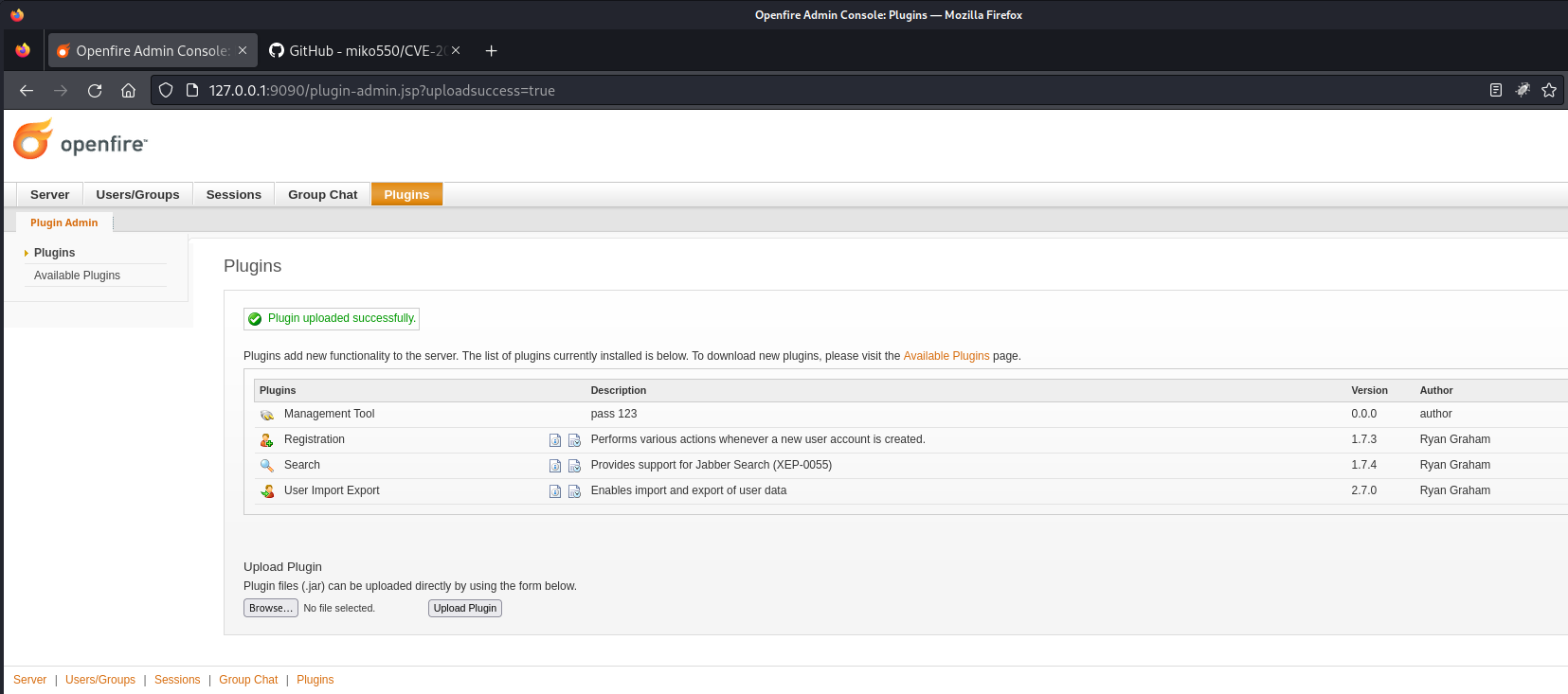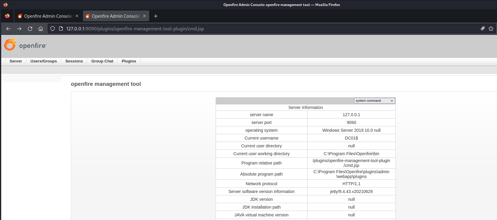 After accessing http://127.0.0.1:9090 we logged in as svc_openfire and used the following Exploit PoC.