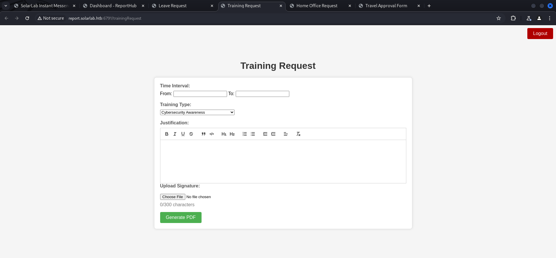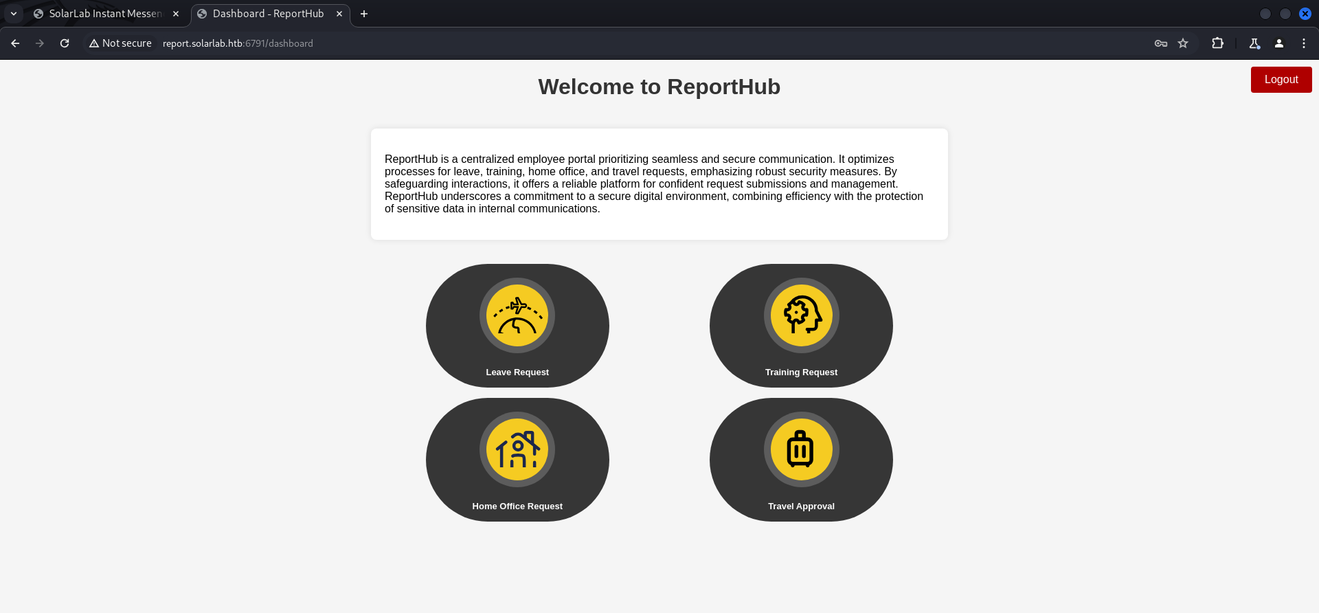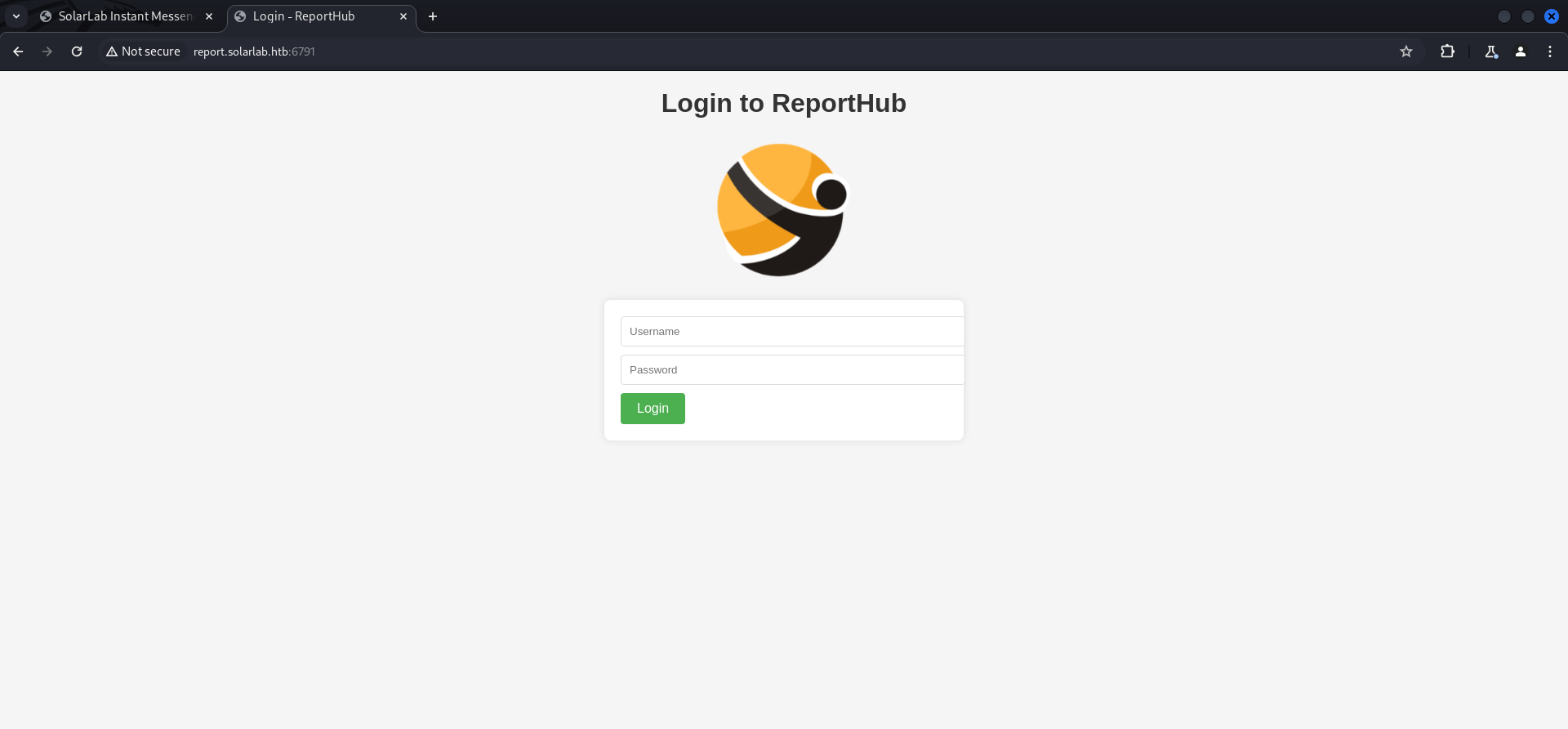 The scans showed a subdomain called report.solarlab.htb, running on port 6791/TCP. We added both, solarlab.htb and report.solarlab.htb to our /etc/hosts file.