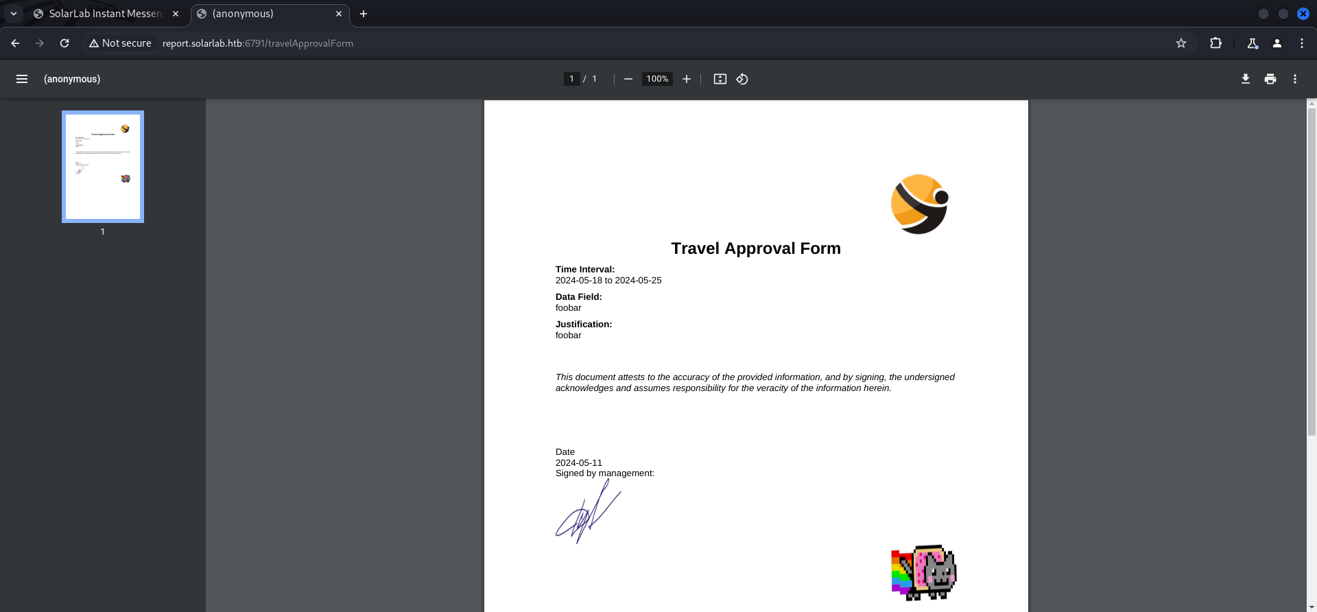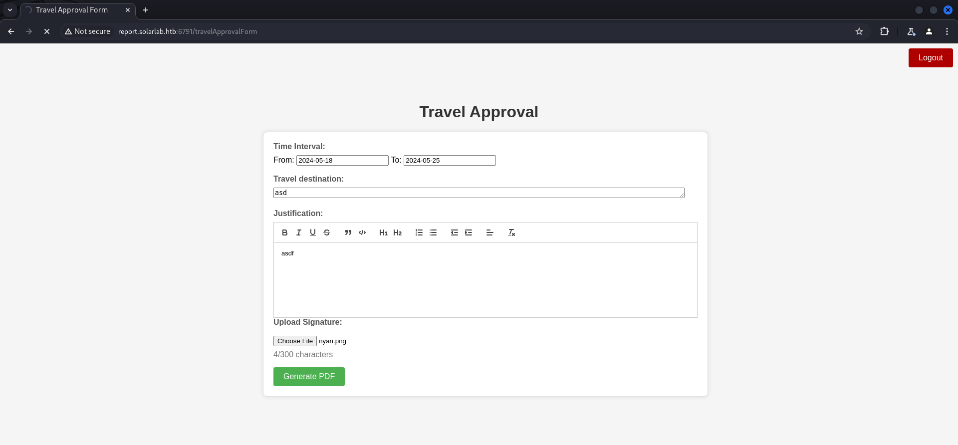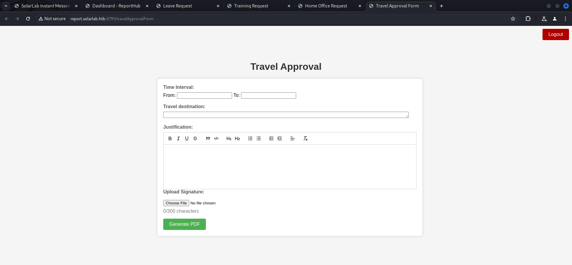 The scans showed a subdomain called report.solarlab.htb, running on port 6791/TCP. We added both, solarlab.htb and report.solarlab.htb to our /etc/hosts file.