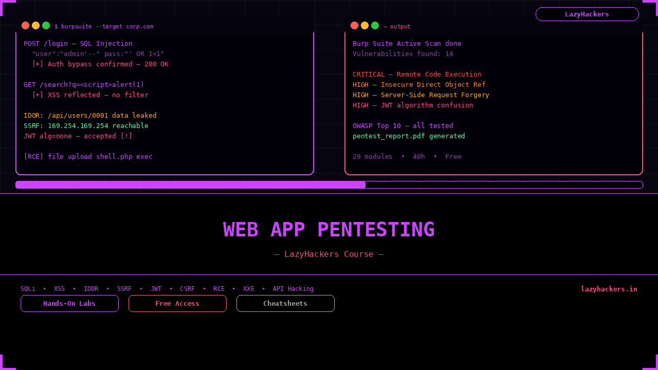 A complete hands-on course covering the full web application penetration testing lifecycle. From passive reconnaissance to advanced injection techniques, API testing, and professional reporting. Built around real-world OWASP methodology.